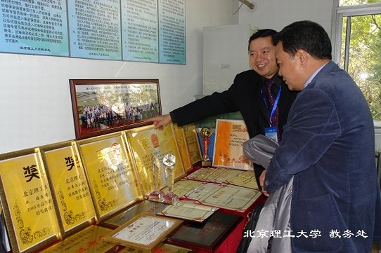 专家组成员张湘伟参观本科教学获奖证书、奖杯