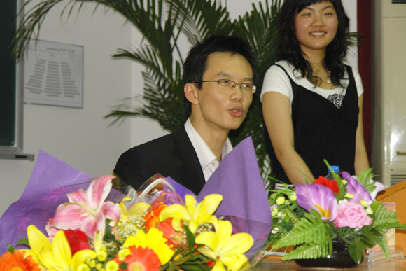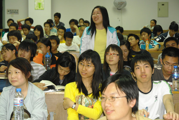 这些问题充分的体现了我校同学广泛的阅读面和深厚的人文功底。 最后,工作人员将江南的作品《光明皇帝》报上讲台,并决定将这些书籍分发给热心的观众。本次共青讲堂得到了校科幻协会的大力支持,因此他们得到了5本赠书。另外还有若干本分发给提问价值很大的同学,最后还剩下4本,主持人选择了非常别致的一种方式:江南先生自己挑选4个关于他作品的问题,台下观众进行抢答,答对者得到赠书。