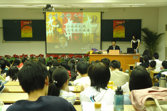4月25日晚,著名东方奇幻小说家江南先生成为“共青讲堂”第十三位嘉宾,应邀来到我校与我校同学作近距离交流。江南先生在广大高校学子之间有着非常高的知名度,演讲所在的教室早早地就坐满了翘首以盼的热心观众。到了七点,主持人走上讲台,还没来得及宣布,观众已经发觉了江先生的到来,不约而同地鼓起掌来。