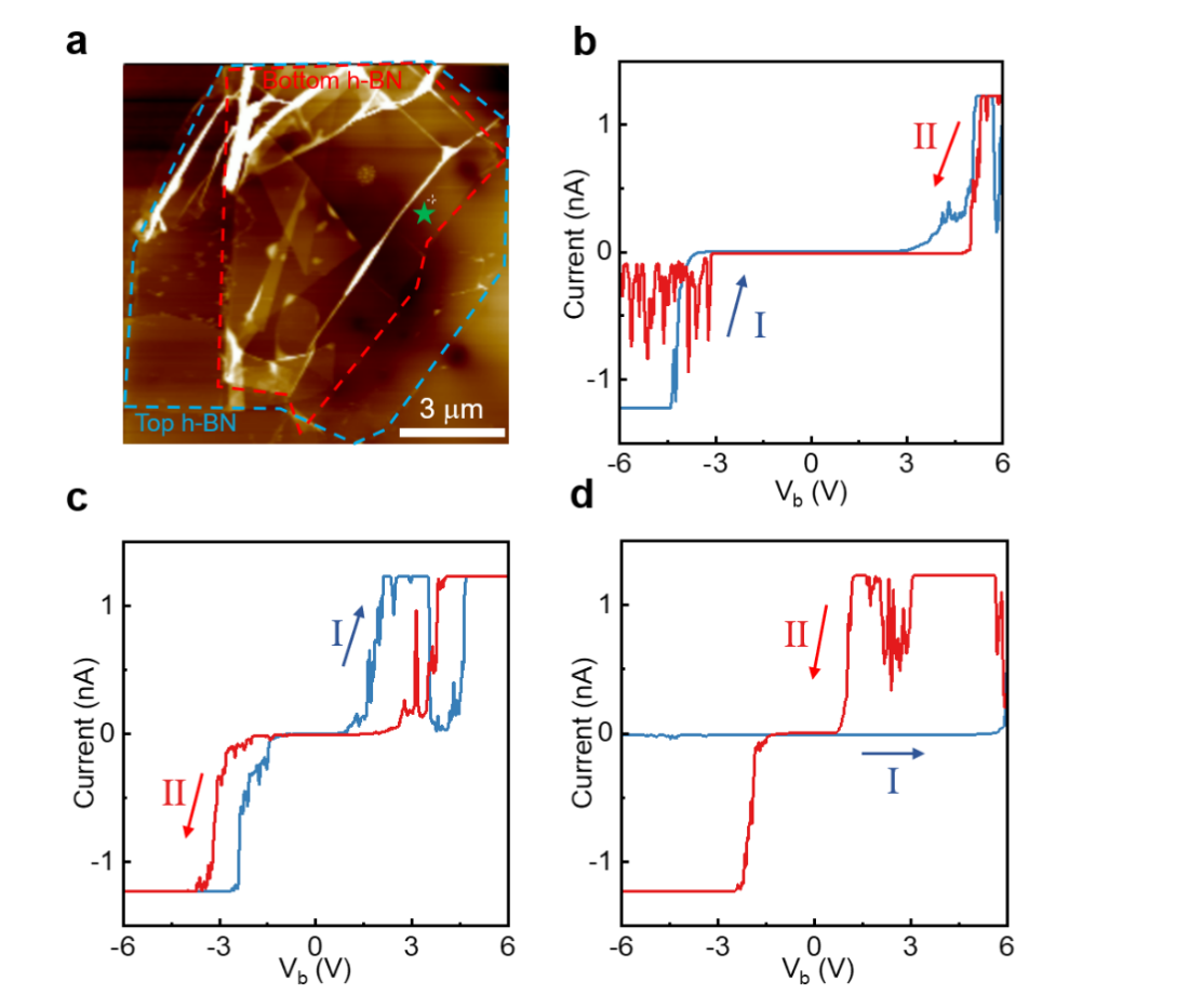 图5展示了滑移忆阻器的C-AFM图。图a展示了PS-BN在石墨烯薄片上的原子力显微镜图(上下两层h-BN均以虚线标出)。图b-d展示了PS-BN 在同一点上的I-V 曲线和忆阻行为(图a中绿色星形标记处)。